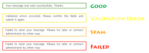When Akismet judges a message as spam, Contact Form 7 sends no mail and shows a response message with an orange border line (the third example in the picture below).